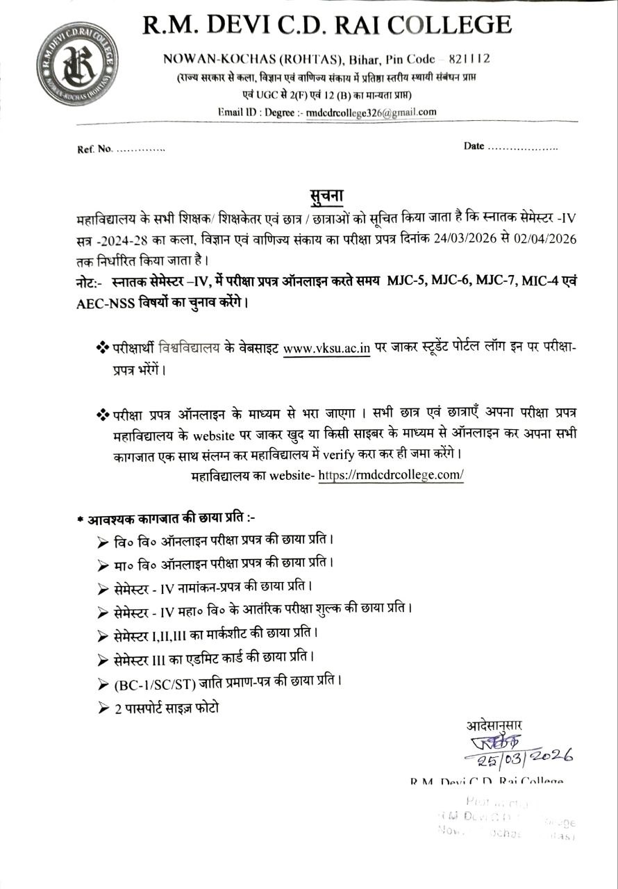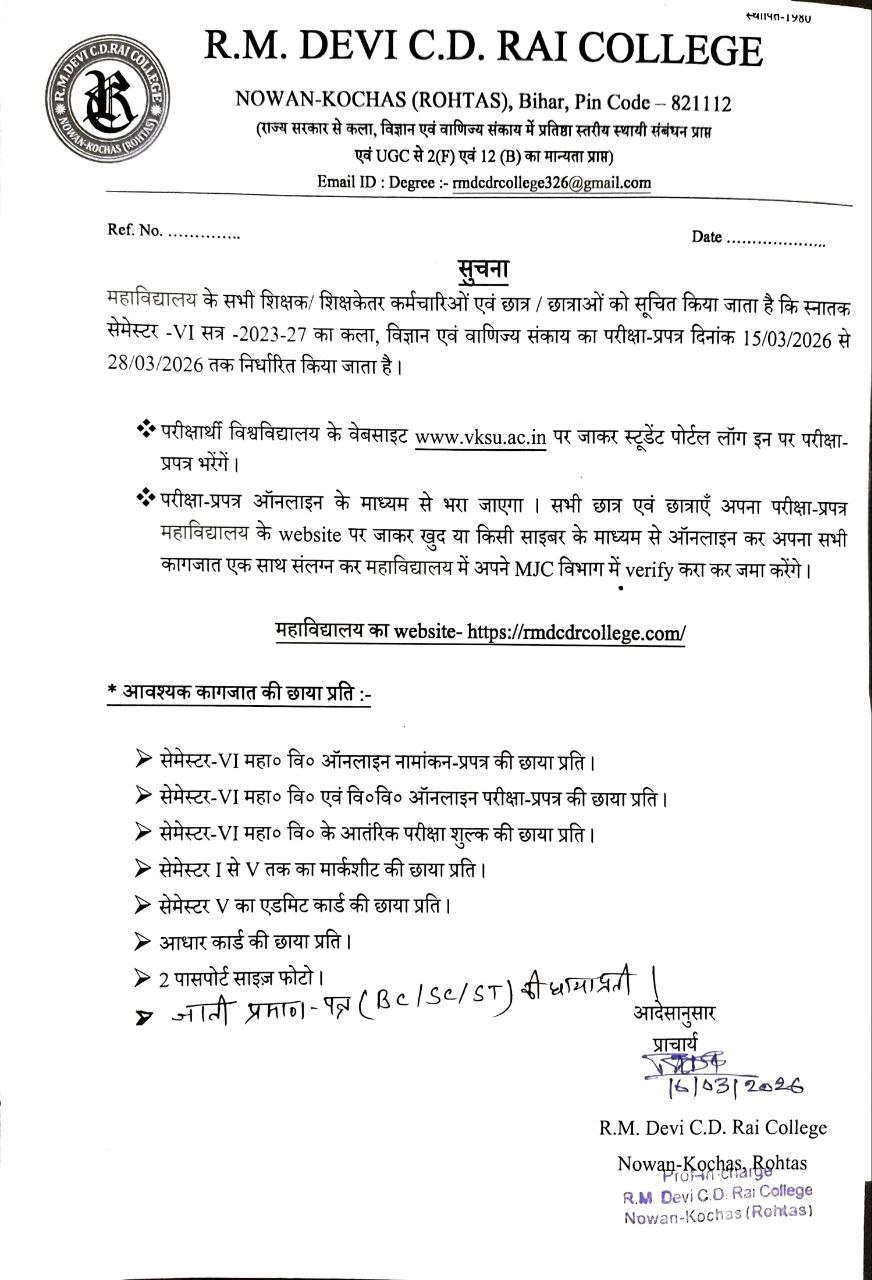 RM Devi CD Rai College, Nowan, Kochas Rohtas was establish in Rohtas district of Bihar. The college was established for all round development of poor villager’s student. The main goal of the college is to provide Quality Higher education for poor people Rohtas District.